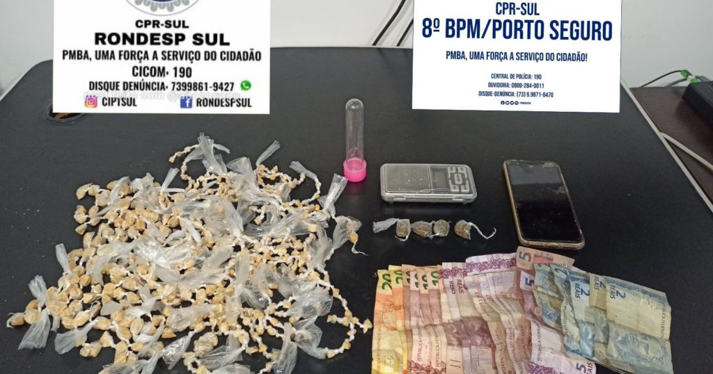 Como resultado da operação, foram apreendidos com a dupla 04 papelotes de maconha pesando 06 gramas, 166 pedras maiores de crack pesando 90 gramas, 326 pedras pequenas de crack pesando 69 gramas, 01 celular, 01 balança de precisão e R$ 155,00 em espécie. O casal recebeu voz de prisão em flagrante e foi conduzido para a Delegacia Territorial de Porto Seguro.