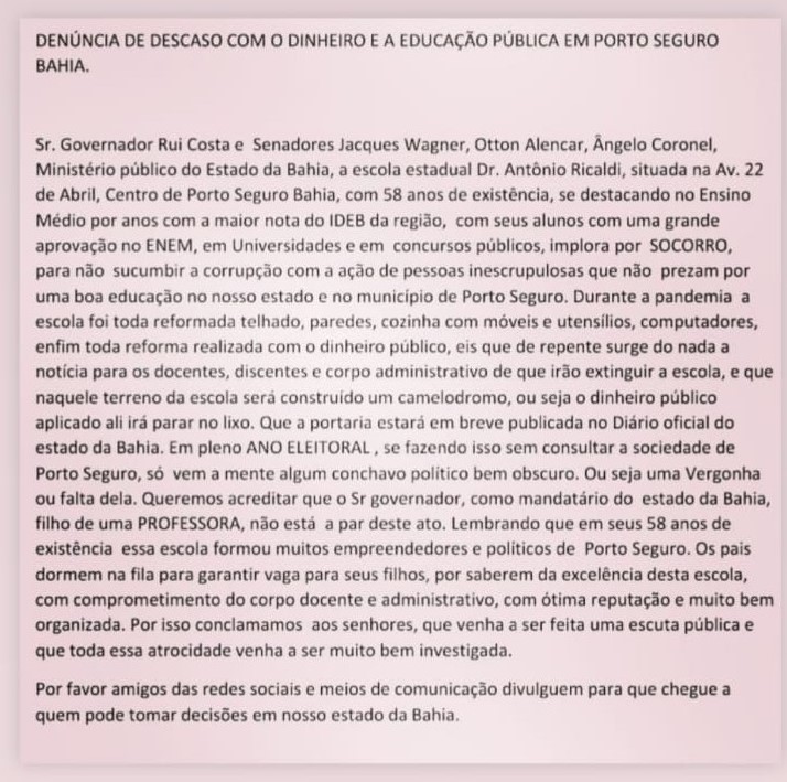 Segundo a direção do Ricaldi, foi enviada uma notificação do Governo do Estado, apenas informando que após encerramento do ano letivo de 2021, a escola será fechada. Segundo informações, será construído um camelódromo no local. O que o corpo docente e a sociedade desejam com a carta é que o Governador faça uma audiência pública para ouvir a população de Porto Seguro ao invés de extinguir um importante equipamento de educação no município.