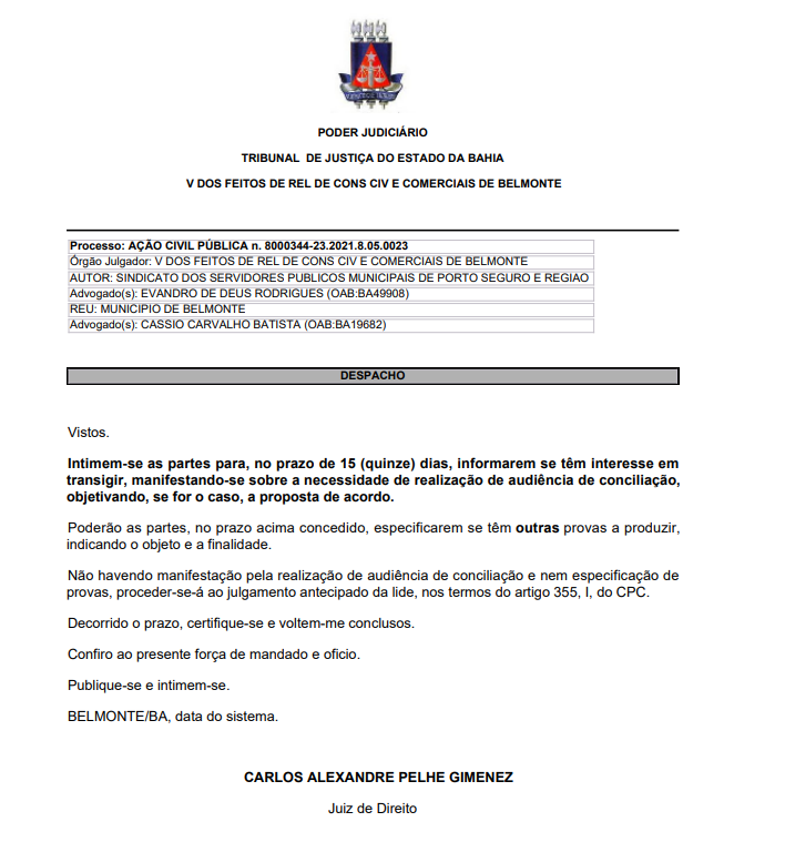 A Justiça de primeira instância em Belmonte emitiu uma notificação ao Sindicato dos Servidores Públicos Municipais de Porto Seguro e Região (SINSPPOR) e à Prefeitura Municipal de Belmonte. O objetivo é que ambas as partes se manifestem sobre o interesse em uma audiência de conciliação, visando uma possível proposta de acordo em relação à situação dos servidores concursados que foram demitidos pelo Prefeito Bebeto Gama em 2021. A Justiça ressaltou que as partes têm 15 dias para se manifestar e também têm a opção de apresentar provas durante esse período. Caso não haja interesse, a intimação indica que o processo seguirá para o julgamento antecipado.