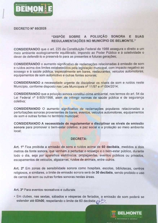 A Prefeitura Municipal de Belmonte anunciou novas medidas para combater a poluição sonora no município, por meio do Decreto Municipal Nº 60/2025. As regulamentações definem os limites legais para emissões sonoras, as condições para a concessão de autorizações e orientam as equipes de fiscalização da Secretaria Municipal do Meio Ambiente.