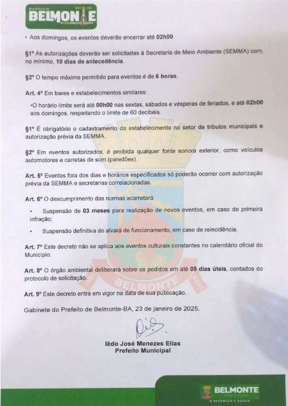 O decreto também regulamenta as emissões sonoras durante eventos recreativos e culturais. O limite máximo permitido é de 60 dB, com horários específicos para encerramento: