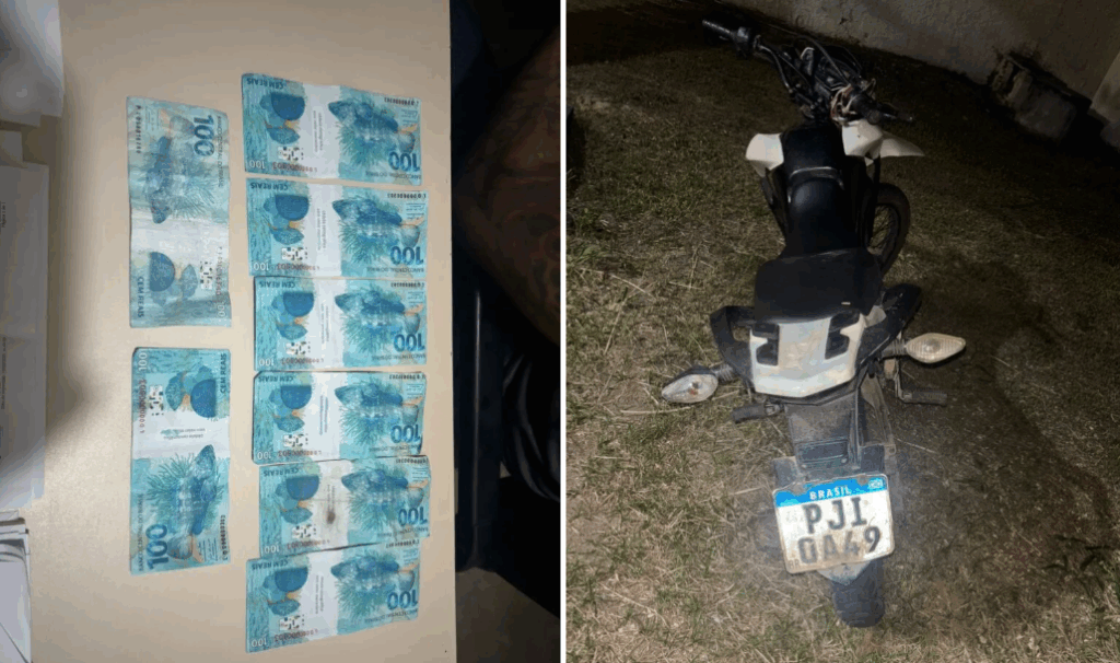 Dois homens foram presos em flagrante pela Polícia Militar na noite deste domingo (21/09) em Belmonte, na Bahia, após serem flagrados com sete notas falsas de R$ 100,00 e uma motocicleta roubada. A ação aconteceu na BA-001, quando a guarnição atendia a um acidente de trânsito. De acordo com a PM, os policiais avistaram dois suspeitos em alta velocidade em uma motocicleta Honda Bros, desobedecendo a ordem de parada. A guarnição iniciou uma perseguição e conseguiu interceptar a dupla na entrada da cidade.