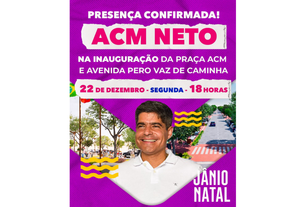 O ex-prefeito de Salvador e pré-candidato ao governo da Bahia, ACM Neto, desembarca em Porto Seguro no próximo dia 22 de dezembro de 2025, às 18h, para um dos eventos mais aguardados do calendário municipal. Neto participará, ao lado do prefeito Jânio Natal, da cerimônia de inauguração da nova Praça ACM e da requalificação completa da Avenida Pero Vaz de Caminha.