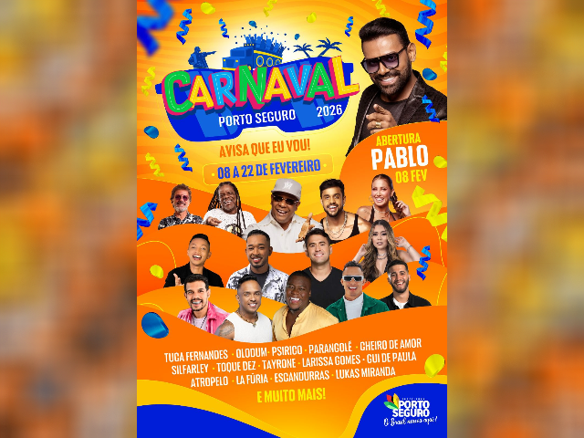 A Prefeitura de Porto Seguro apresentou, nesta terça-feira (23), a grade oficial de atrações para o Carnaval 2026. O anúncio foi realizado em uma coletiva de imprensa na sede da Secretaria de Turismo, contando com a presença de representantes da Associação Brasileira da Indústria de Hotéis (ABIH). Com a promessa de transformar a Terra Mãe do Brasil no “polo mundial da pipoca e diversão”, a gestão municipal prepara uma estrutura robusta para os foliões entre os dias 8 e 22 de fevereiro.