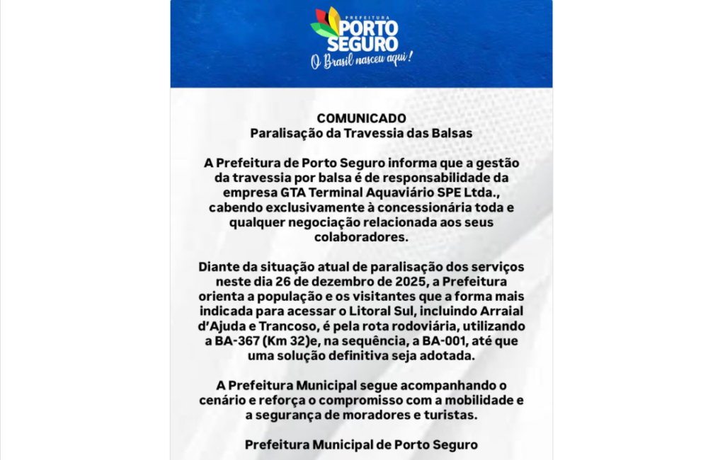 Nesta sexta-feira, 26 de dezembro de 2025, moradores e turistas que tentam realizar a travessia entre Porto Seguro e Arraial d’Ajuda enfrentam a paralisação dos serviços de balsa. Diante do impasse, a Prefeitura de Porto Seguro emitiu um comunicado oficial esclarecendo as responsabilidades sobre a operação e orientando a população sobre como chegar aos distritos turísticos.
